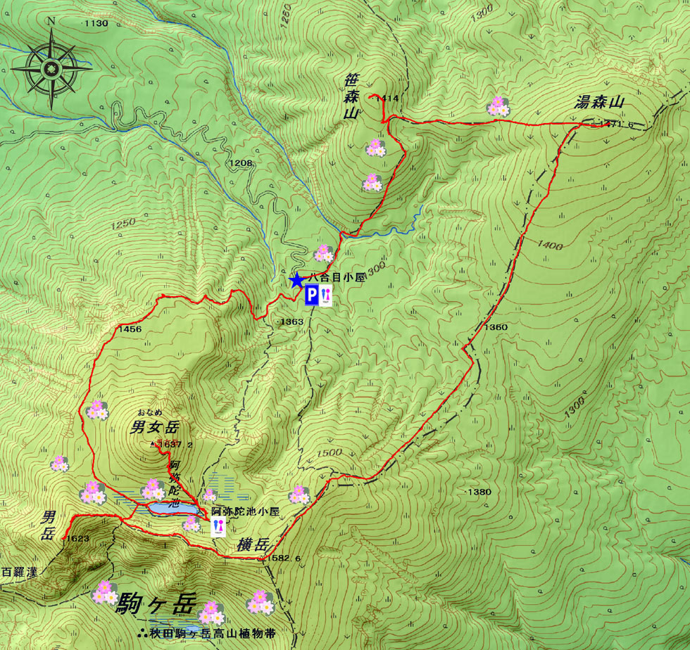 (計曲線 50M 主曲線 10M) 八合目小屋P標高/1300M 最低標高地点/1249M 標高差/388M 総歩行距離/11405M |