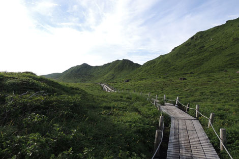 正面が目指す笹森山 | 開花には早かったがニッコウキスゲ群生地を通過 | |||