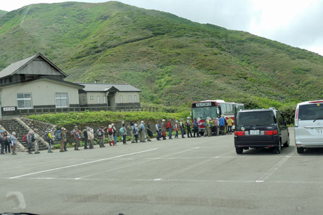 マイカー規制時間内に八合目駐車場から麓に下りる場合は受付で事前申請し定期バスの後方に付いて通行する | ||||