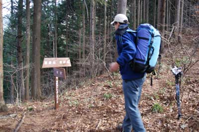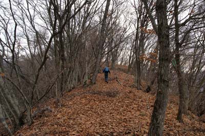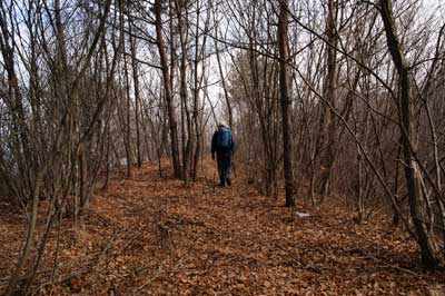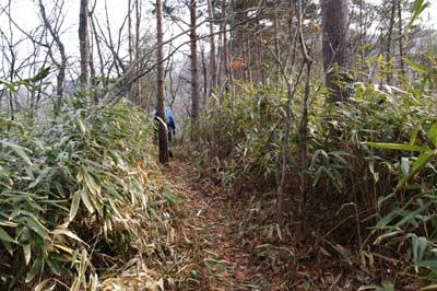 緩い上りの奇妙山支尾根を歩く | 笹やぶになると岩沢登山口分岐点が近い | |||