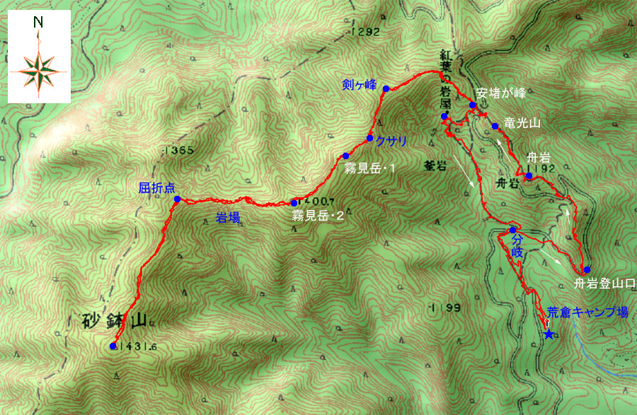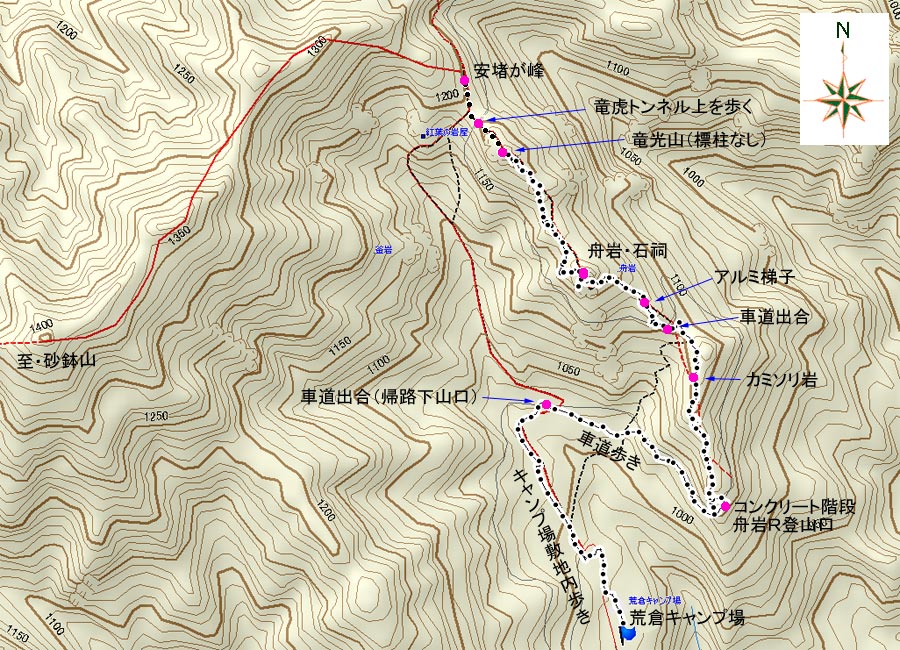 荒倉キャンプ場−舟岩−竜光山−安堵が峰 ルートMAP