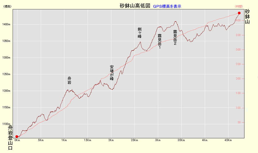 コンクリート階段・舟岩登山口〜砂鉢山高低図 |