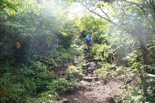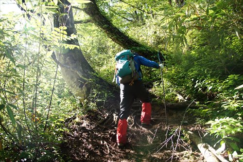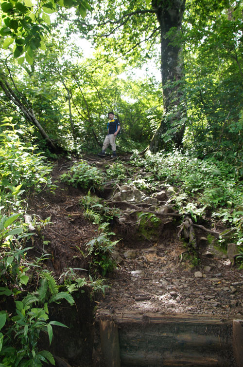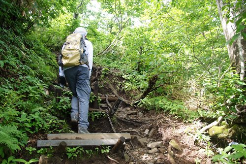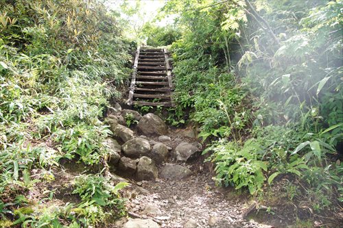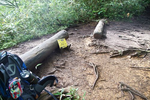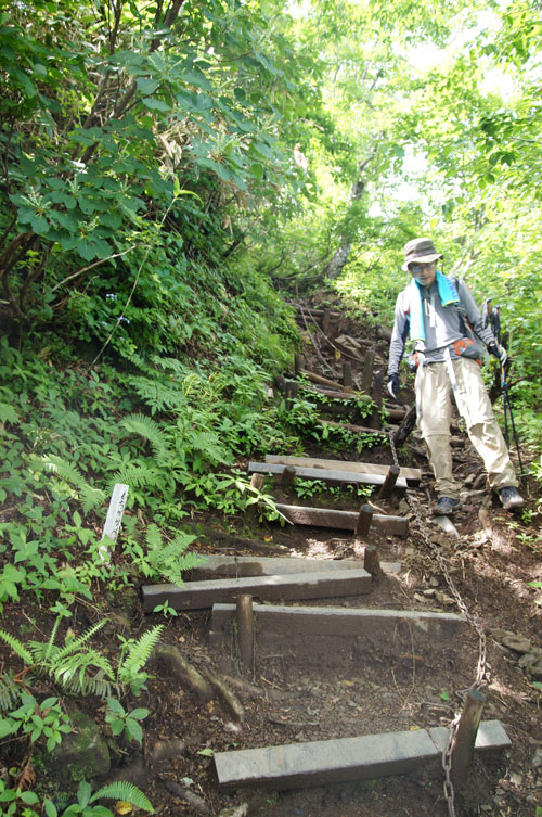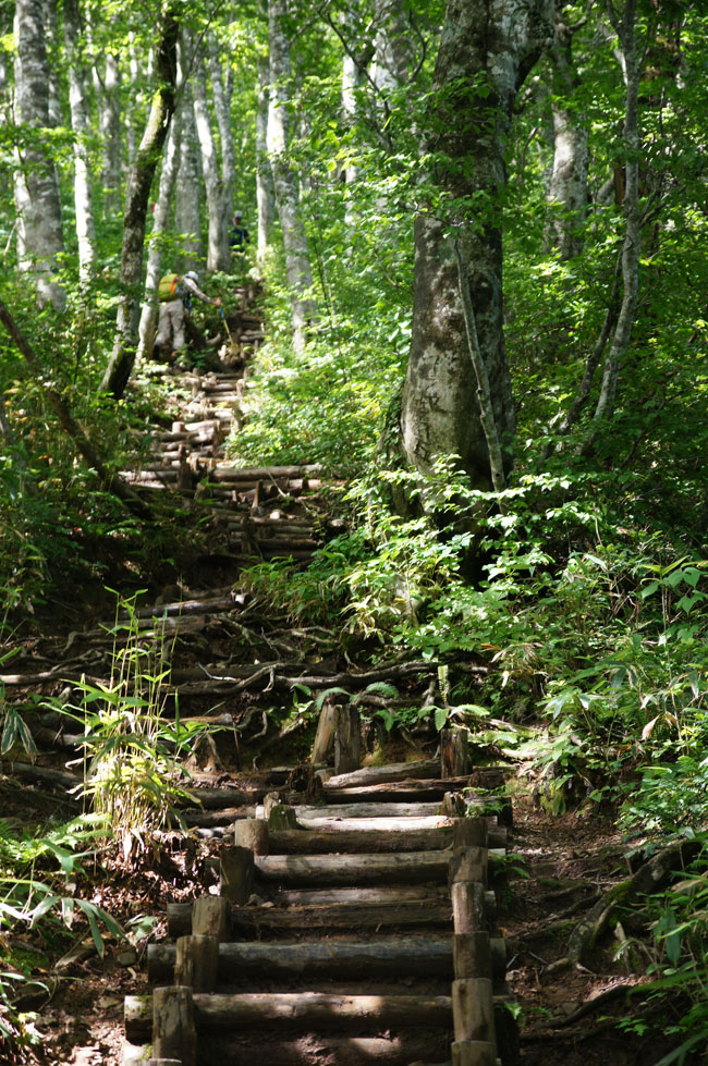 〜 水場(応急用)8:55 〜 長〜い木階段そのA 8:56 〜 小荒島岳分岐点(しゃくなげ平)9:22-30