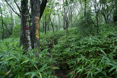 「植生保護のために迂回してください」との注意書きとロープが張ってあり、右のササ道を行くと