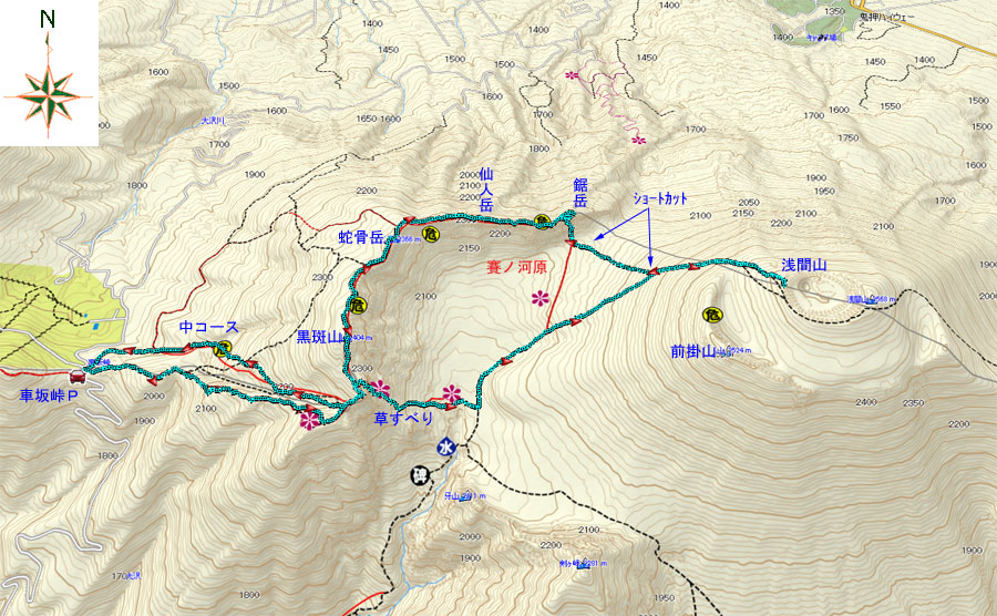 車坂峠登山口標高 1973M 標高差 595M 総歩行距離 14590M |