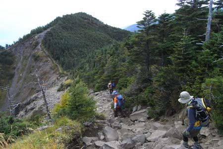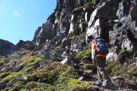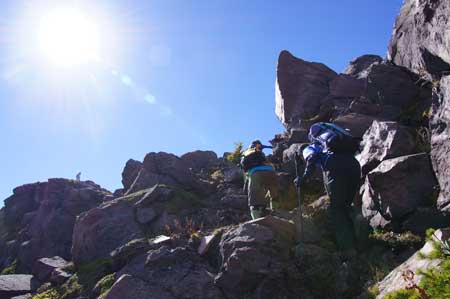 虎ノ尾の縁を登りこむ/鋸岳分岐点より |
