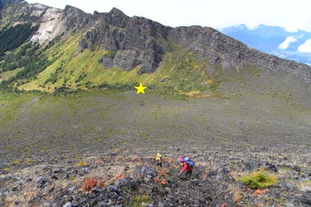 Jバンド登山口(星印)と賽ノ河原/Jバンド上部より |