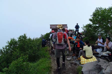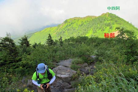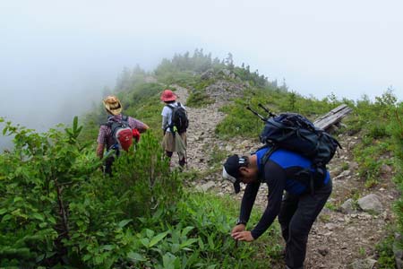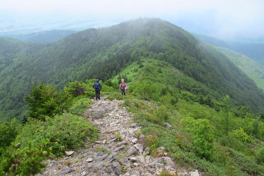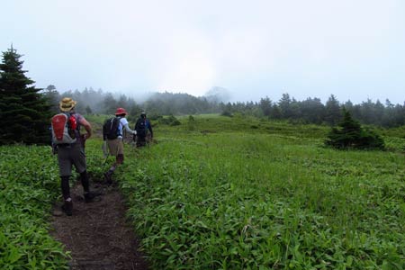 ガスで見られなかった山頂からの展望に未練を残しつつ的岩に向けて下山開始 (ToT) | ||||