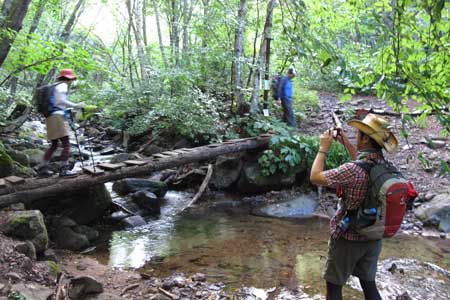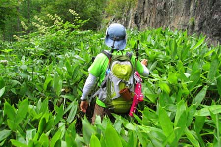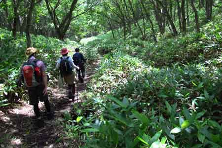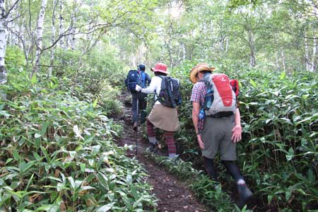 大明神沢を渡る | 笹原&白樺樹林帯を登り込む | |||