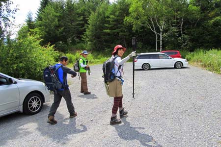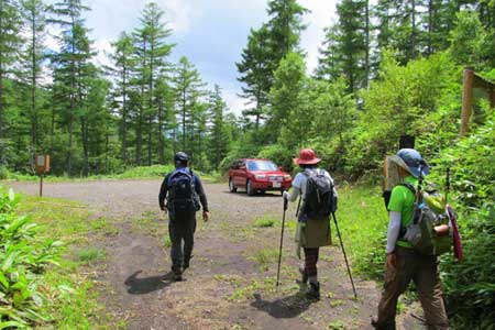 的岩から鳥居峠へ向けて下山開始 | 林道終点期間限定仮駐車場(簡易トイレ) 下段地図参照 |