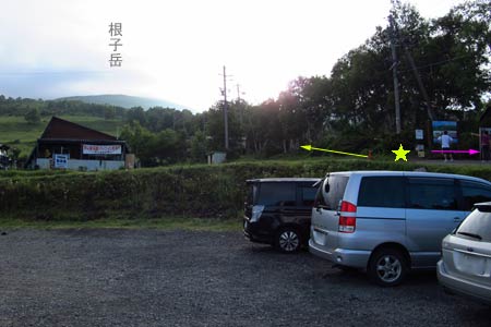 菅平牧場駐車場(トイレ有り) 管理費1名200円 黄色矢印=阿根子岳 ピンク矢印=四阿山へ |