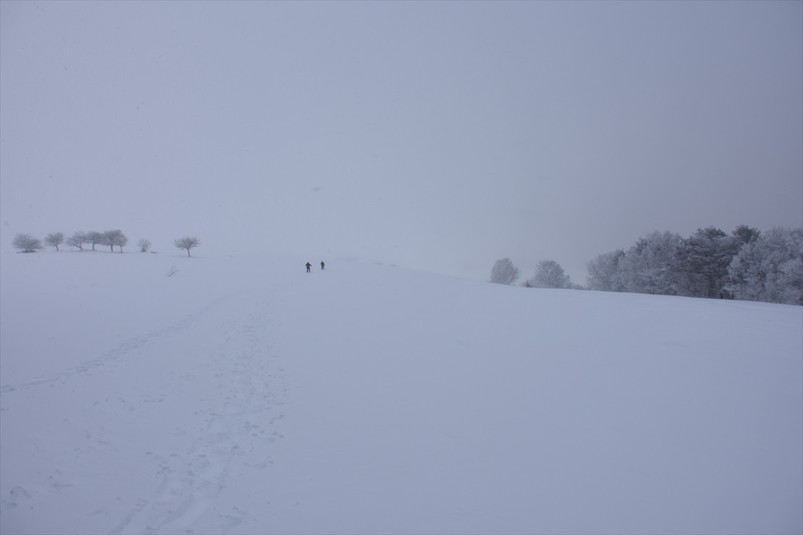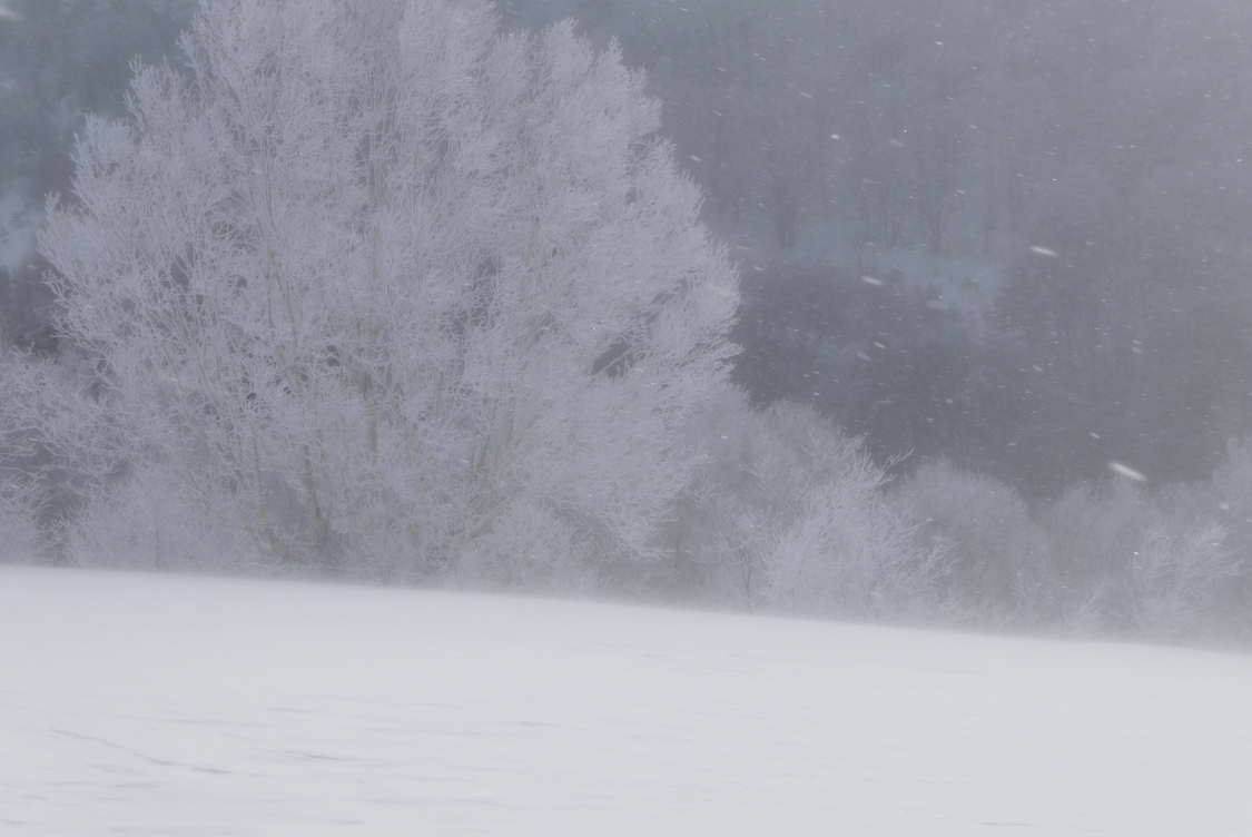 牧場に出たが横殴りの強風とホワイトアウト一歩手前の状態に気持ちが萎える! |