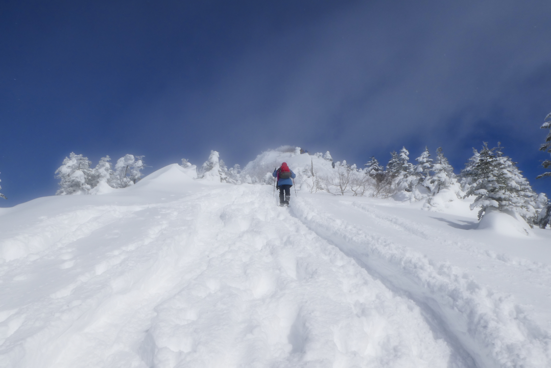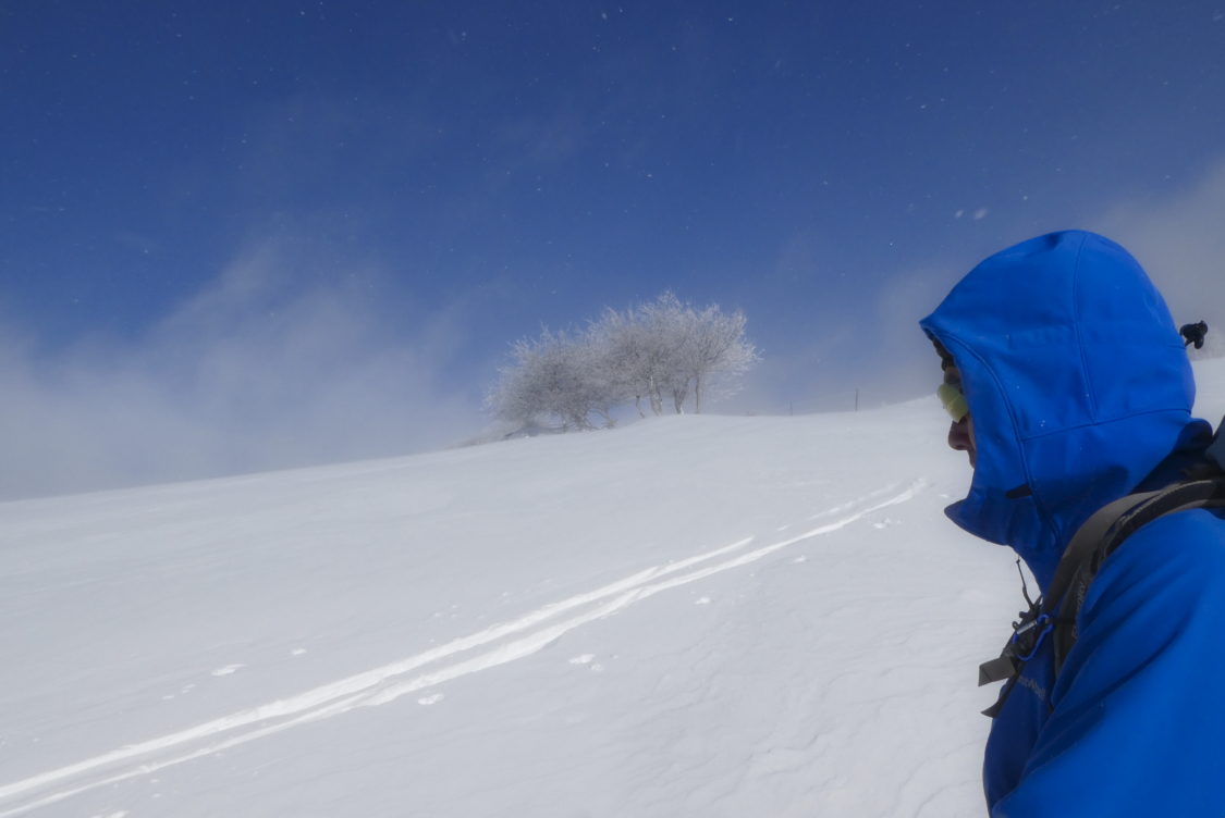 横殴りの強風を避けるため樹林帯の横を登りこんでいます |