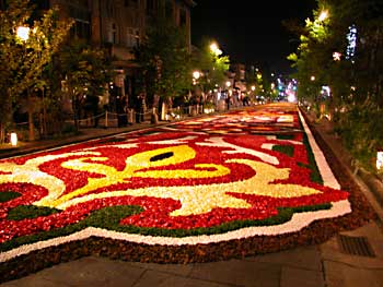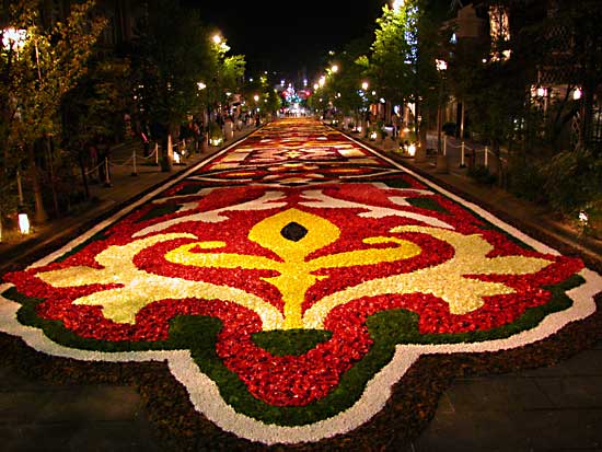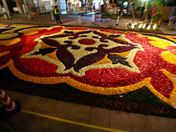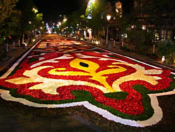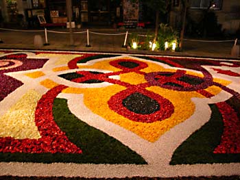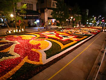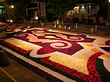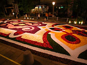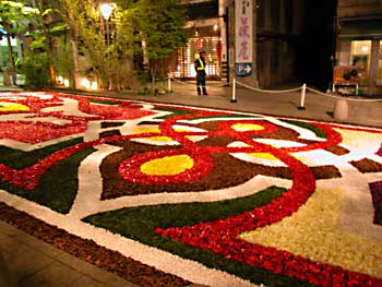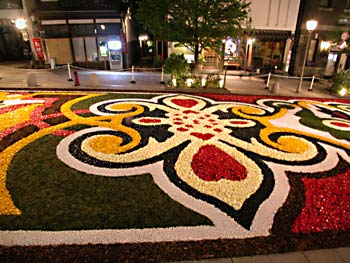 長野花フェスタ2003 ・ 長野市大門町にチュウリップなどの花びらで 路上に絵を描く催しが行われました。 03.04.28 am 00:30 撮影 インフィオラータ(花を敷きつめる・花の絨毯) |