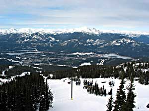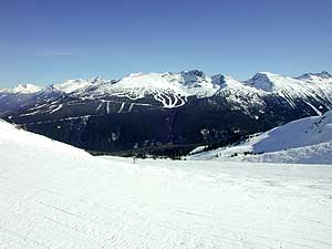 BLACKCOMBスキー場・セブンスヘブン(谷の向こうはウィスラ−スキ−場) リフトは、目に見えている約3倍の距離で下に続いている。 (リフト一本の長さと、ゲレンデの広さを想像して下さい。) |