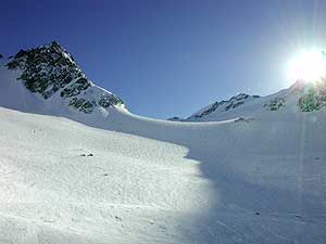 Blackcomb Glacier このバーンは時間にならないと入れず、新雪を求めオープンと同時に先を争って滑り込みます。 |