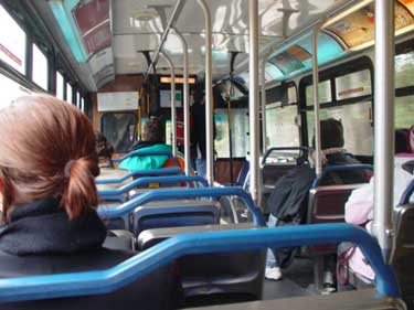 主要バス停には路線図が表示されている | バス停で降りるときは窓枠上部の紐を引っ張る | ||