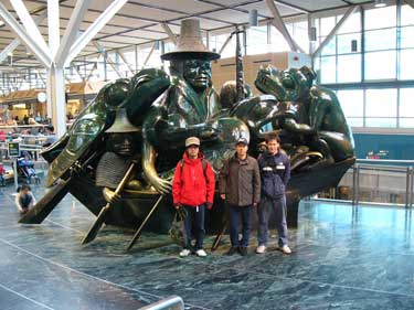 空港内お約束の撮影場所/2010年冬季オリンピック引き継ぎ完了の市長挨拶会場となった (右側は大阪府八尾市から一人で参加した菱川さん) |