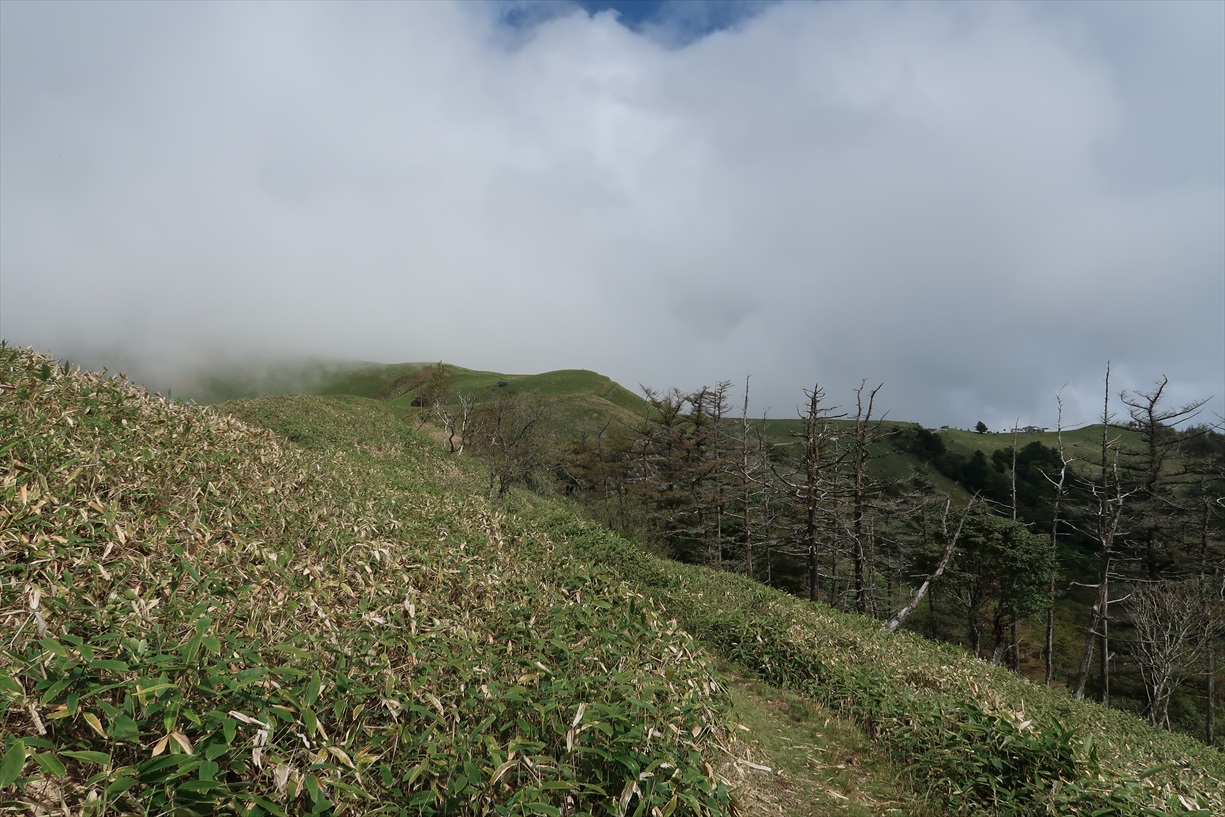 雲に隠れている場所が目指す茶臼山 それにしても茶臼山山頂は遠いな〜(ノД`) |