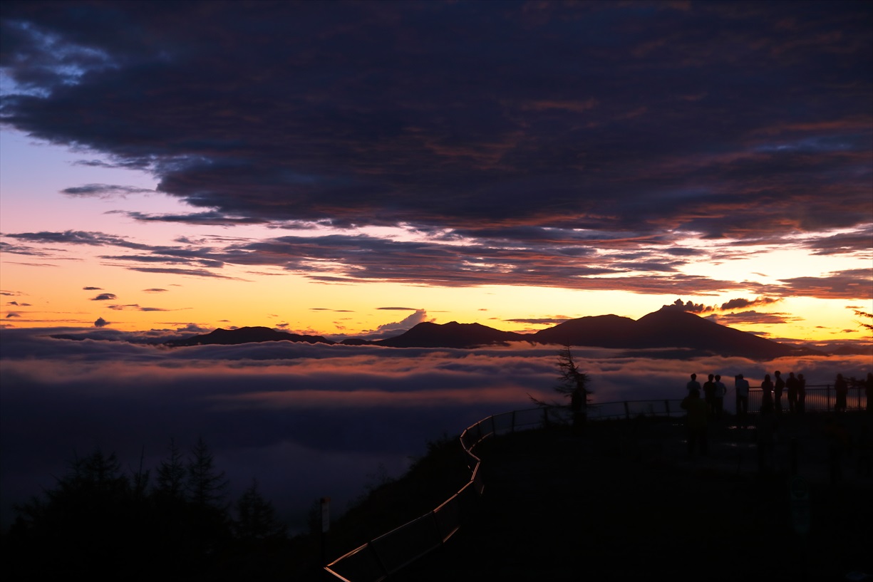AM 5:00 山本小屋ふるさと館駐車場からの展望 ここに車をデポして八島湿原駐車場へ向かう予定だったが満車のため「道の駅・美ヶ原高原美術館駐車場」に変更 |