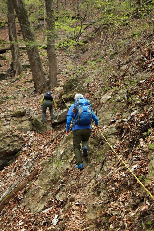 このトラロープ地点を登りきればマル分岐点の鞍部が近い! |