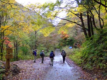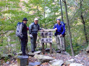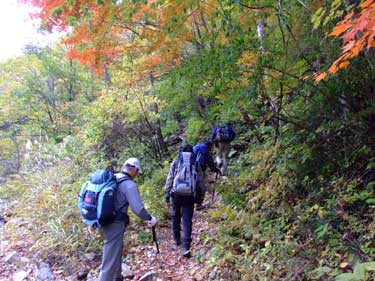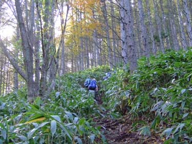 樹林と熊笹に囲まれ見通が悪い急登攀が中間点まで続くが、紅葉を楽しみながら「山頂まで100分・