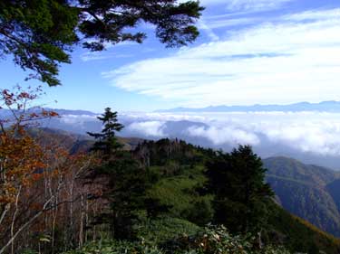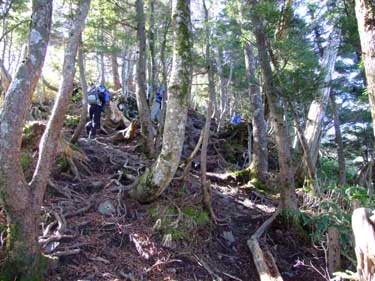 ここを過ぎると間もなく左斜面笹越しに南アルプスが見え始め、高度が増す毎に中央アルプス・南アルプス