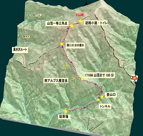 下部に黒井沢ルートが並行して走る。(黒井沢ルートは避難小屋で合流)
