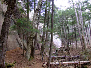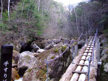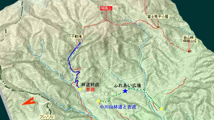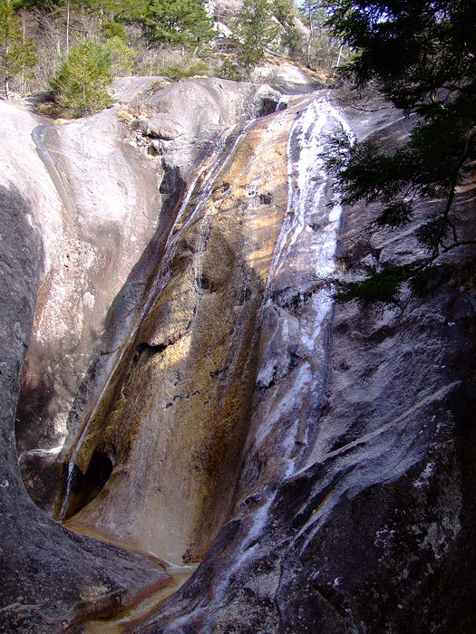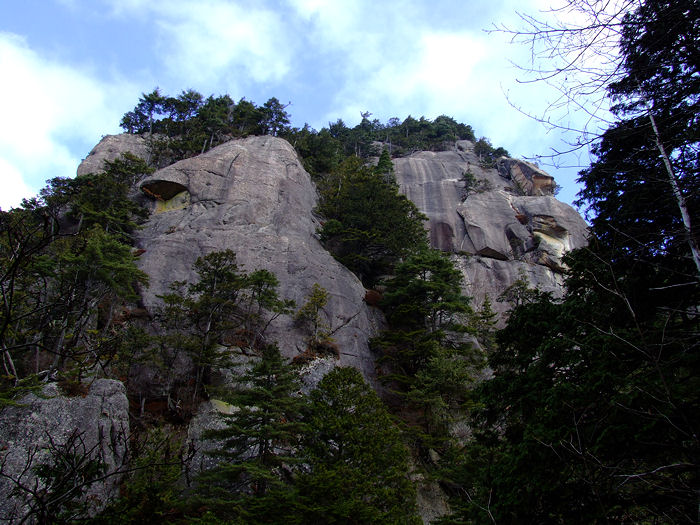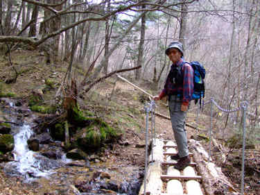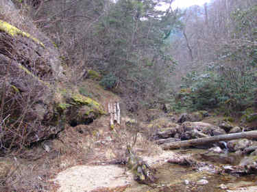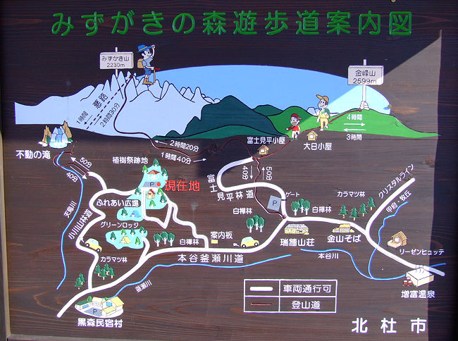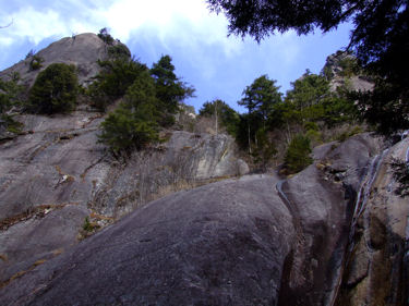 アクセス 下の「みずがきの森遊歩道案内図」参照 画像クリックで拡大表示されます。 不動滝(瑞牆山)ルート解説 ふるさと広場を通過し、小川山林道と合流したら右折して林道終点地点に向かう。 右折して直に未舗装となりRV車以外は腹を何回も擦るであろう悪路となる。 小さな橋を渡った場所が終点で7・8台の駐車スペースがある。 駐車場所から雑木林の広い道を瑞牆山目指して進むと、瑞牆・不動滝の指導標が現れここで左に折れる。 イグアナの形をした岩峰や、ロッククライマーには垂涎の的になりそうな大岩を通過すると不動沢に沿って 架かる立派な木橋が現れる。 ここから沢づたいに岩峰や沢の景色を楽しみながら20分ほど歩くと不動滝に出る。 各木橋には「手すりに注意」の標柱があり最後の9つ目(古い橋は除く)を渡った場所が不動滝だ。 次回の下見を兼ね少し先まで足を延ばしてみたが、地図に書いてあるとおり荒れた登山道で不動滝までの ハイキングコースと比べれば雲泥の差であった。 mikio コメント 瑞牆山は何回か登ったが、ミセスハイジさんのブログを拝見するまで不動滝の存在をしらなかった。 一風変わったこの滝を、春先に雪解け水がとうとうと流れる姿を思い浮かべながら眺めてきました。 |