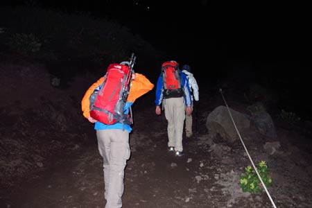 防寒対策をして出発⇔後続者のヘッデン光跡 |