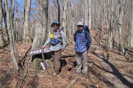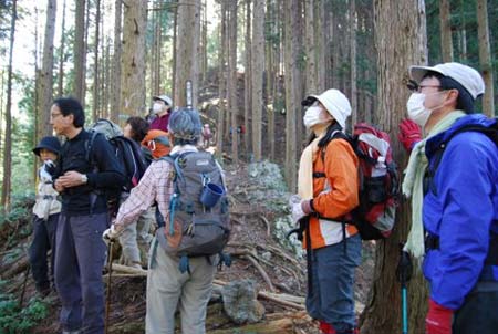 尾根ルート分岐点手前の杉林で休憩中 登山にもマスクが必需品になってきましたね〜 |