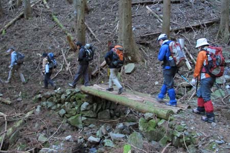 丸太橋を渡る/山頂まで3.7km地点 | 九十九折れの急坂が尾根R分岐点の稜線上まで続く | |||
