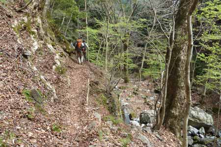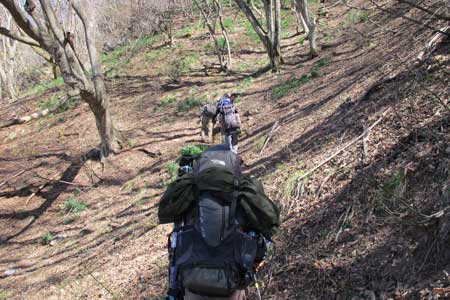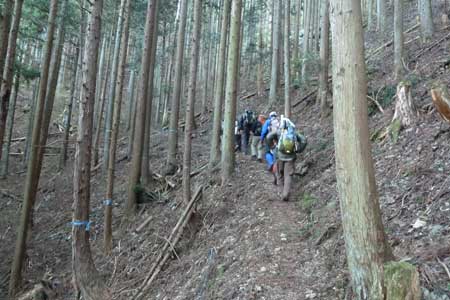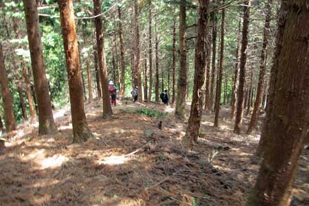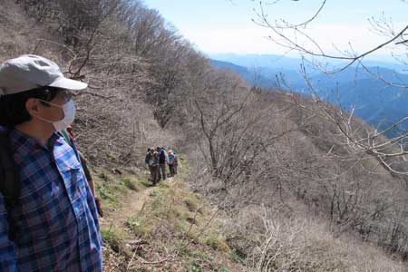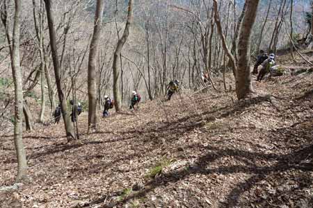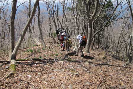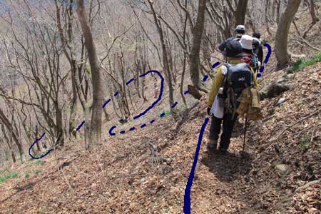 小舟伏山を通過するとミズナラなど広葉樹林の急坂下りとなる。 西ルートも九十九折れで真下を登山者が歩いているので落をおこさぬよう慎重に歩きたい。 |