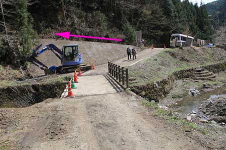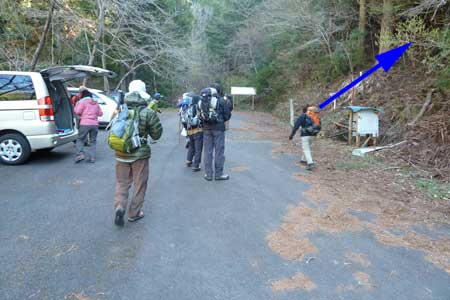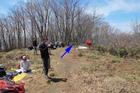 ひと歩きで → | あいの森広場(西ルート登山口)に到着 赤矢印で東ルート登山口へ向かう |