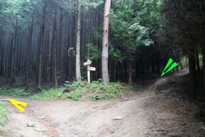 右手に建つ修検場をすぎるとY字の分岐点で、右は林間コースを経て月山〜二ツ箭山へ、左は男体山・