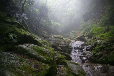 杉林を抜け沢が近づくとひと歩きで石祠が祀られた「御神体の滝」にでる。