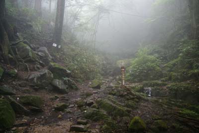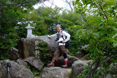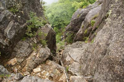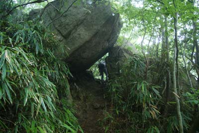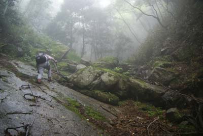 左斜面の尾根コースから一枚岩や胸突き八丁の急坂をクリアして胎内潜り(雨で先を急いだためパス)など
