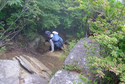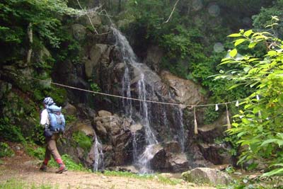 滝の横にかかるクサリを登り、石に苔が付着して滑りやすい沢道を進むと「〆張場」と呼ばれる分岐点