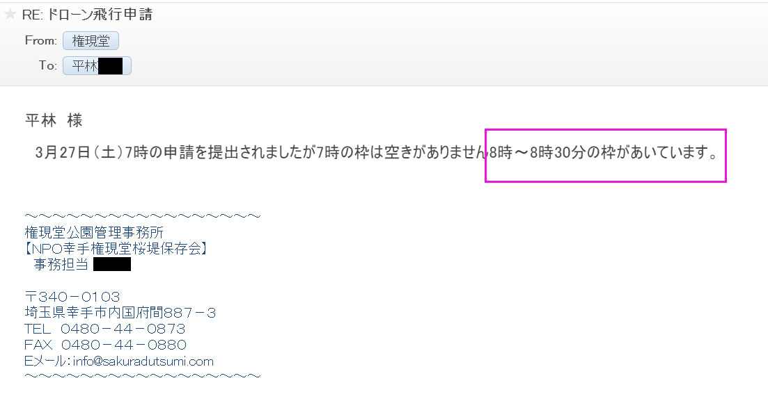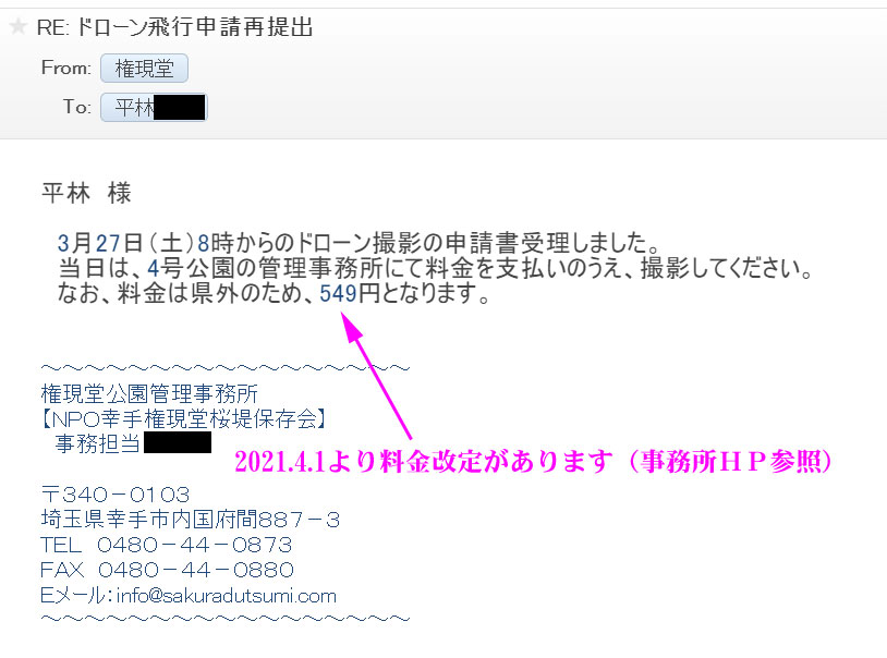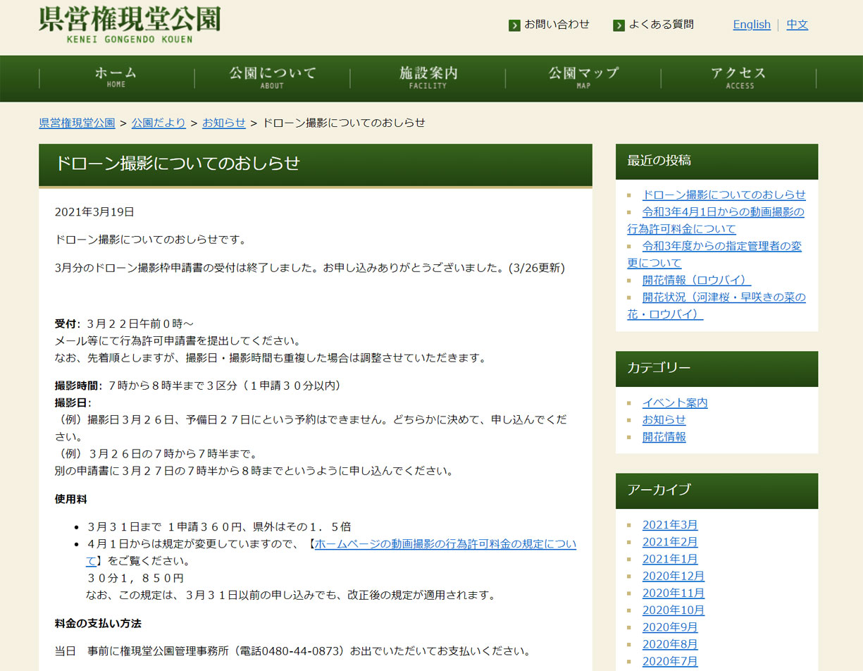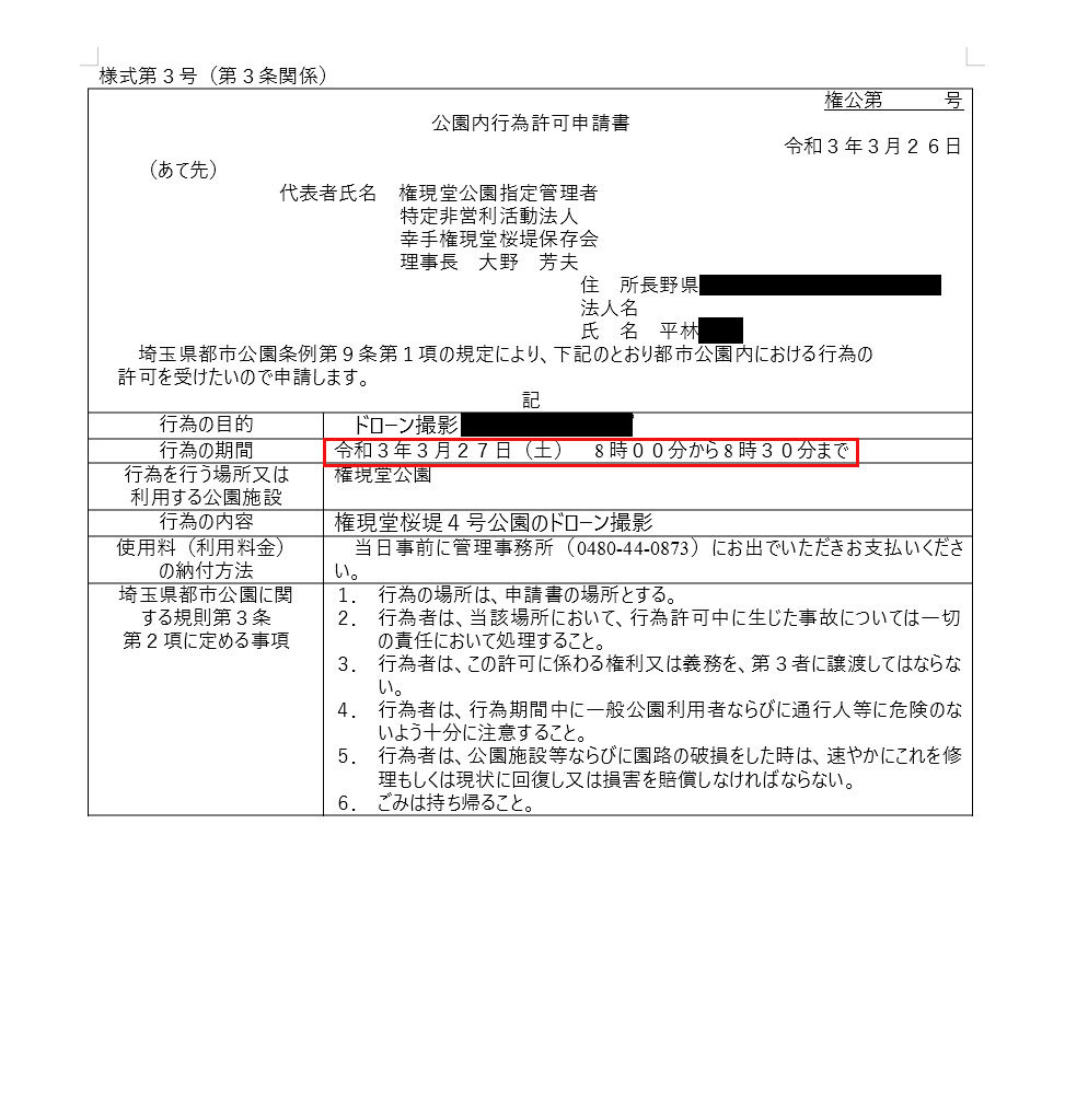 権現堂公園事務所HPからドローン飛行申請用紙をDL 撮影可能時間=7:00-7:30 7:30-8:00 8:00-8:30の三枠 必要事項記載後、添付ファイルでメール送信 |
