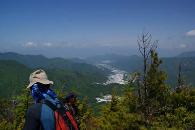 五郎山山頂下の展望適地に立つ仲間/東肩より山頂 |