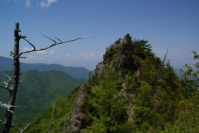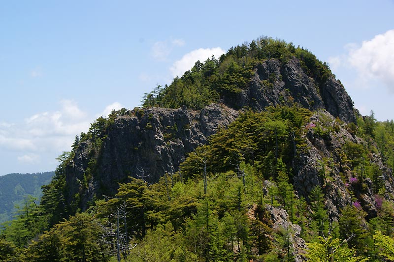 五郎山(ドーム風岩頭)とP2(山頂右下の岩稜)・「マキヨセノ頭」東側岩稜部より撮影 |