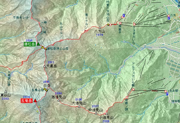 解説 唐松岳頂上山荘から五竜岳に向かう。 岩稜を下り大黒岳をすぎ、シラビソの樹林に入ると、唐松岳と五竜岳の最低鞍部に出る。 鞍部からは登りになり、ハイマツ帯のザレた斜面を行く。 白岳ノ肩で遠見尾根からの道と合流し、五竜山荘へ下る。 山荘からは岩稜の道を進むが、尾根の右を巻き、やがてジグザグの道を急登し、稜線に出る。 ぺンキ印にしたがって登っていく。 山頂直下には短いクサリがあり、これをすぎてまもなく、キレット方面の標識が現れる。 五竜岳山頂はこの少し先だ。 三角点は西のピーク上にあり前方には、鹿島槍ガ岳が、振り返れば唐松岳と白馬三山が迫力ある 姿で迫ってくる。 『山と渓谷社・長野県の山』より抜粋 |
