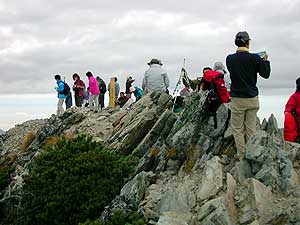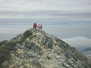コメント 深夜の強風に、テントが飛ばされないか心配で2回程見回りをしました。 4時頃、山頂を目指す人の足音が聞こえる。 5時に朝食(アルファ米) 6時頃、今まで雲に覆われていた五竜岳が顔を出す。 ラッキー!! 山頂では、雲の流れを楽しむ事ができました。 白岳から西遠見山まではクサリ場が多く、西遠見山〜中遠見山の登山道は灌木に覆 われていて気を緩めがちだが、切り立った尾根道なので足下に注意して下山しました。 |