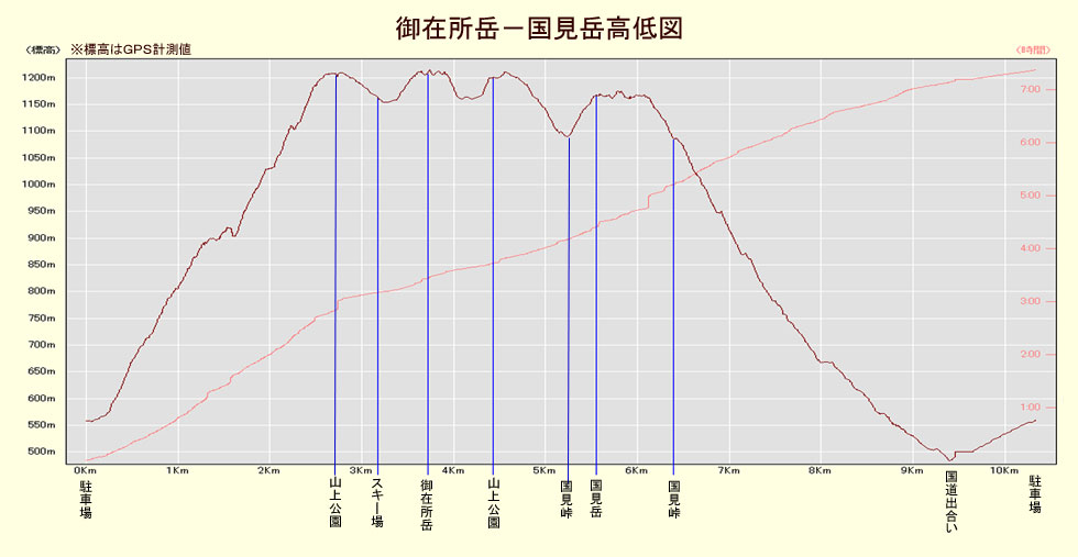 駐車場標高/550M 最低標高/480M 標高差/732M 総歩行距離/10341M |