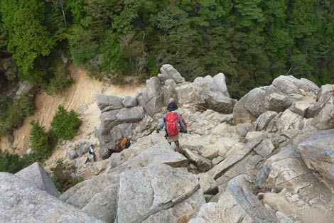 八合目要注意箇所の拡大写真/写真中央に登山者が見える |