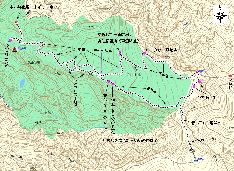 車道標高1845m地点で右側の牧場内に 入ってこの指導標に従う |