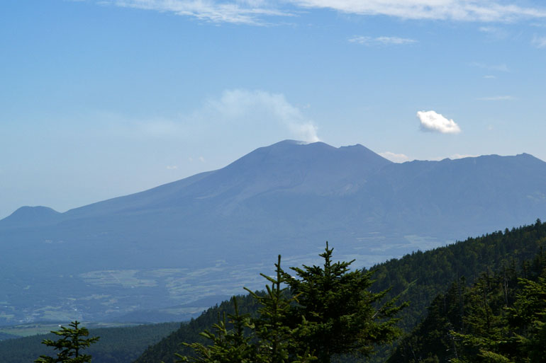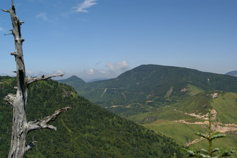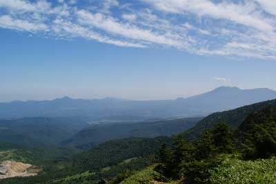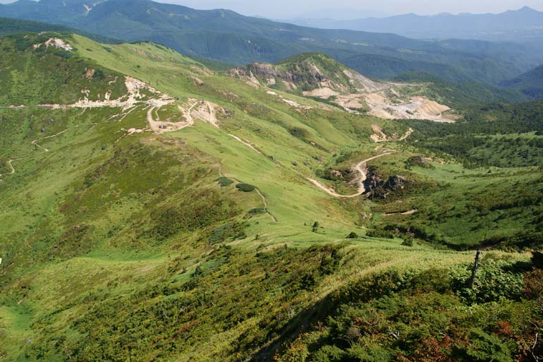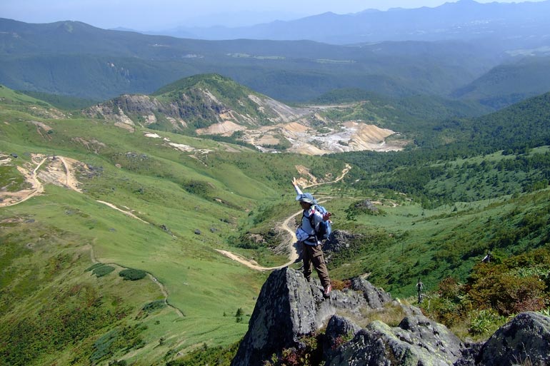 展望岩から毛無峠と小串硫黄鉱山跡を望む | ||||