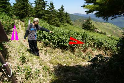 《写真にマウスを》 五味池・破風・土鍋分岐点 左/破風岳へ・右/土鍋山へ |