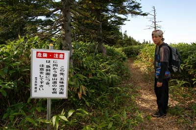 ルート右側は急斜面につき要注意の看板 | 切り払われた笹株が起き上がっていて歩きにくい | |||