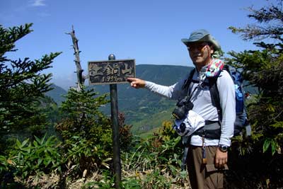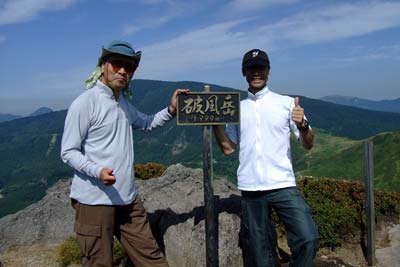 破風岳山頂 1999m 記念撮影中の檀ちゃん | 花や登山談義で盛り上がった 山ノ内の菊池さんと記念撮影 |